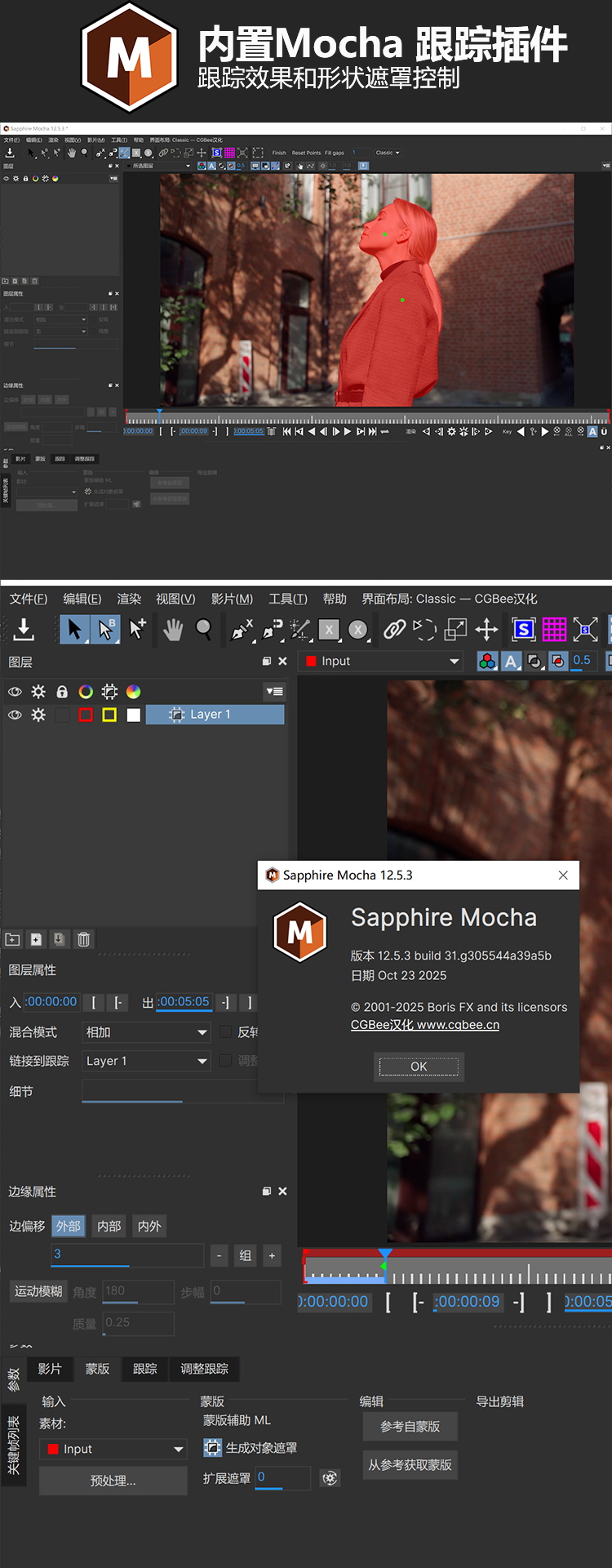 *集成 Mocha (摩卡跟踪)功能:与奥斯卡获奖的 Mocha 平面跟踪和屏蔽引擎整合,在插件中进行快速准确的运动跟踪,提供强大的跟踪和遮罩功能。