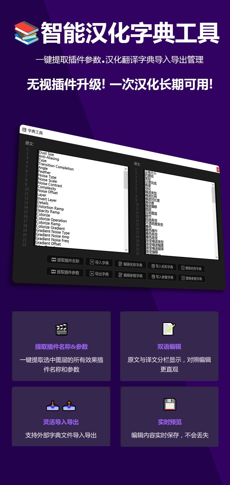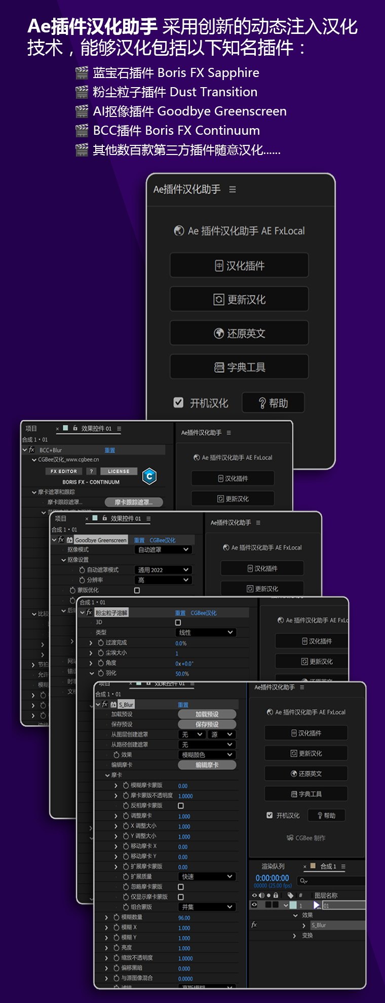 Ae插件汉化助手AE FxLocal,是一款专为 Adobe After Effects 设计的插件汉化脚本工具,由 CGBee 精心打造。它专为汉化After Effects 插件设计开发,让任何朋友无需使用复杂的工具,零门槛,就能让任何人轻松、快速地汉化AE插件,AE 汉化插件助手,除了支持一般的AE插件之外,对于难以汉化的插件例如:蓝宝石插件BorisFX Sapphire,粉尘粒子插件 Dust Transition 、三维渲染插件 Gaussian Splatting、AI 抠像插件 Goodbye Greenscreen……等等都能轻松翻译汉化,让中文用户能够轻松理解和使用各类专业插件,大幅提升插件学习与使用效率。