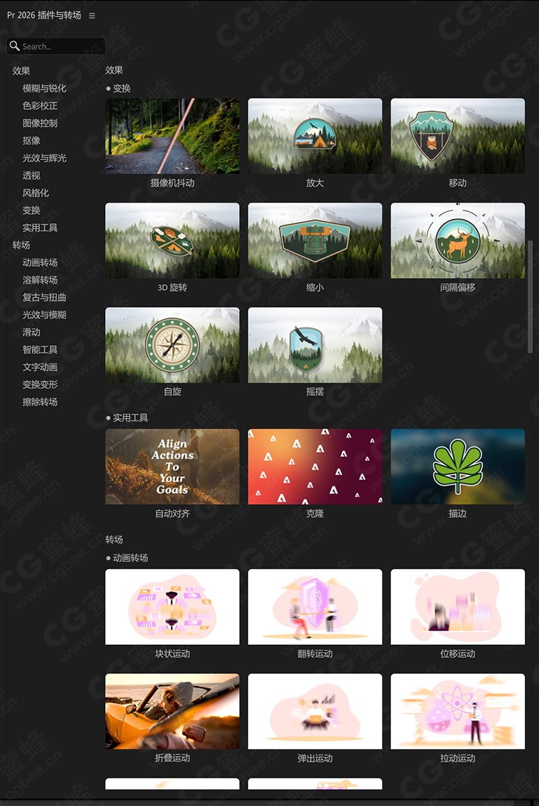 Adobe Premiere Pro 2026(版本 26.0)提供了数百种内置效果与转场,包括基础固定效果、专业视频 / 音频效果以及多样化转场,并集成了90 多种Film Impact 的所有转场和视频效果到内置中,成为pr内置效果与转场,CGBee 以全部汉化(目录名称与参数)